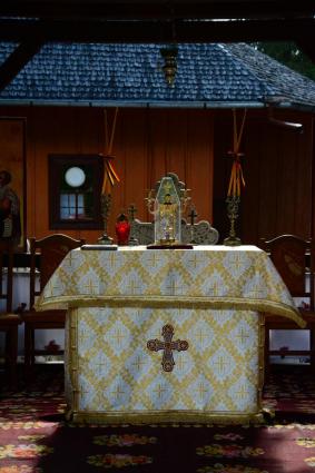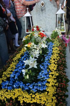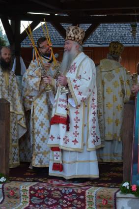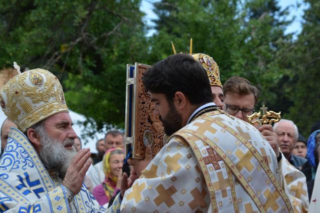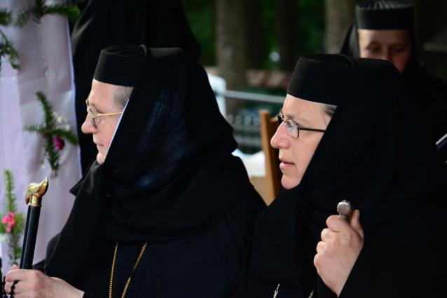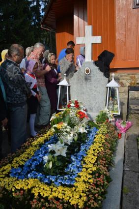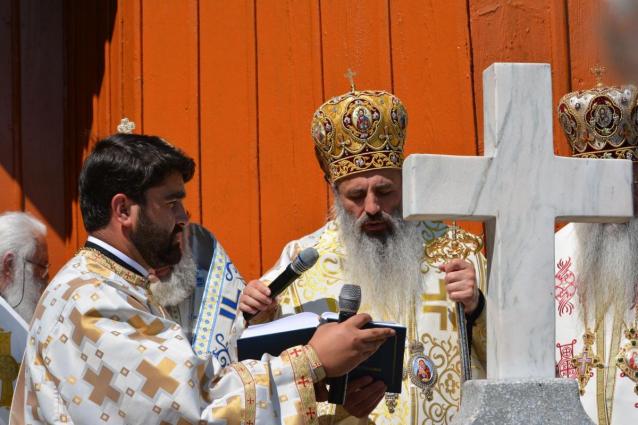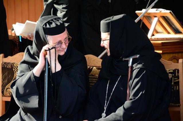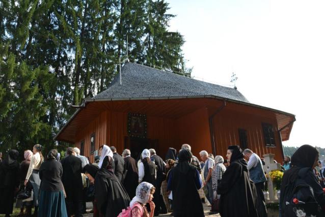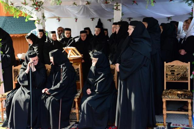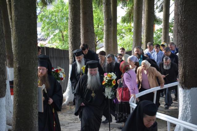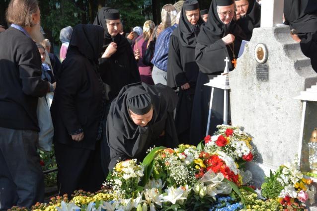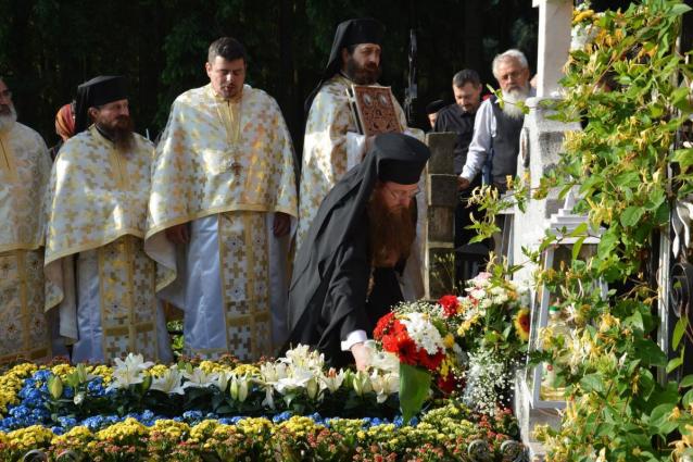 Înaintea de slujba Sfintei Liturghii, ierarhii prezenți au depus flori la mormântul Părintelui Nicodim Măndiță, slujba arhierească fiind oficiată lângă biserica din cimitirul Mănăstiri Agapia.